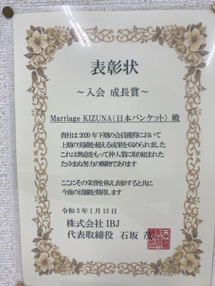 Marriage KIZUNAが加盟しているIBJから表彰されました!